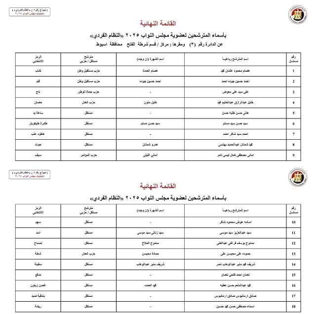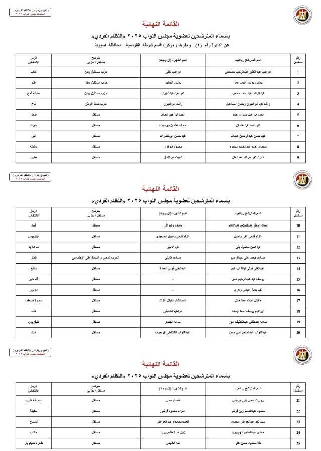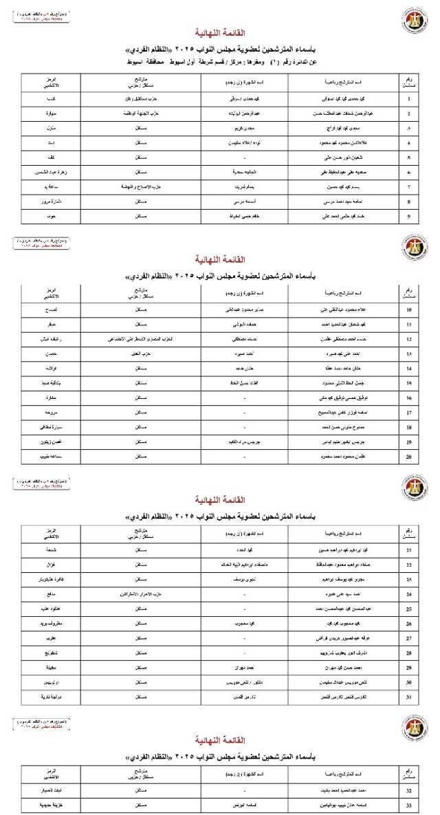 ننشر القائمة النهائية لمترشحي دوائر محافظة أسيوط عن النظام الفردي