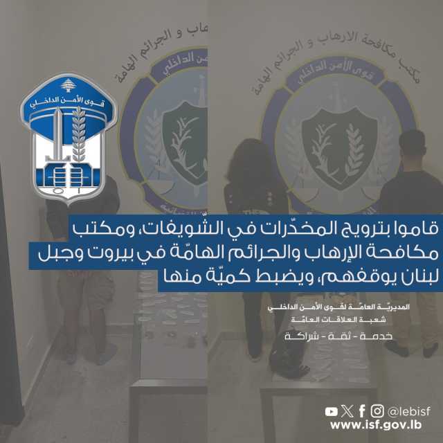 أعلنت المديرية العامة لقوى الأمن الداخلي – شعبة العلاقات العامة في بيان، أن مكتب مكافحة الإرهاب والجرائم الهامة في بيروت وجبل لبنان – وحدة الشرطة القضائية، أوقف ثلاثة أشخاص في الشويفات بتهمة ترويج المخدرات في عمليتين منفصلتين.