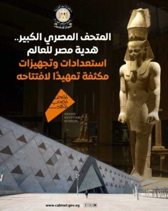 نشر المركز الإعلامي لمجلس الوزراء، عددًا من الإنفوجرافات عبر منصاته على مواقع التواصل الاجتماعي، بعنوان «المتحف المصري الكبير.. هدية مصر للعالم.. استعدادات وتجهيزات مكثفة تمهيدًا لافتتاحه».