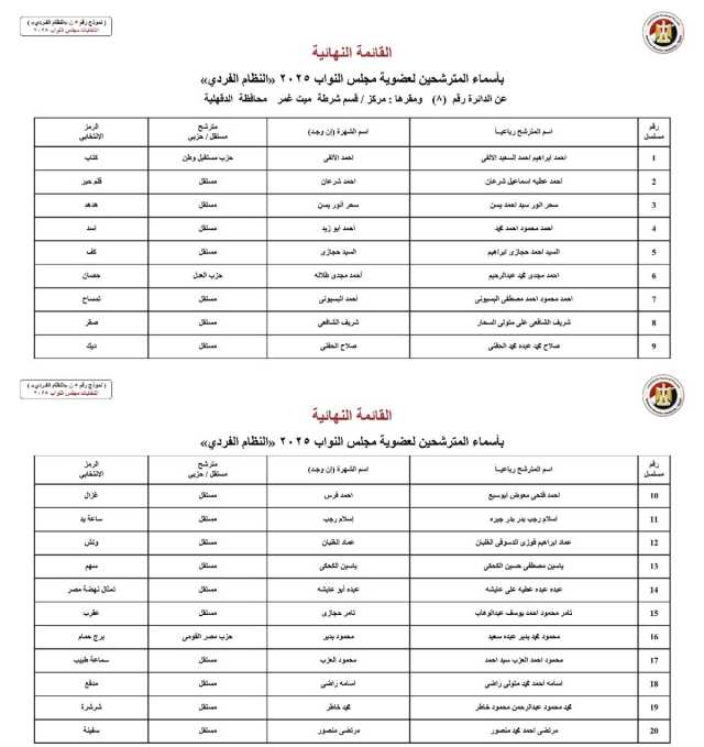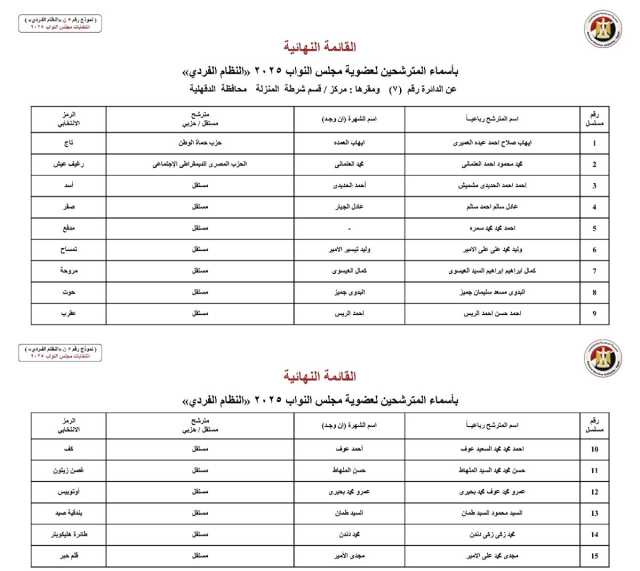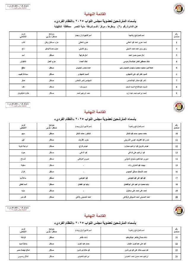 وتضم القائمة المعلنة أسماء المرشحين الذين استقر وضعهم القانوني، حيث تم استبعاد من لم يستوفِ الشروط أو من صدرت ضده أحكام نهائية بالاستبعاد، وكذلك من اختار التنازل عن سباق الترشح. وتعد محافظة الدقهلية من المحافظات التي تشهد زخماً انتخابياً كبيراً نظراً لكثافتها السكانية وحجم التمثيل النيابي المخصص لها، مما يجعل السباق على مقاعد النظام الفردي محتدماً.