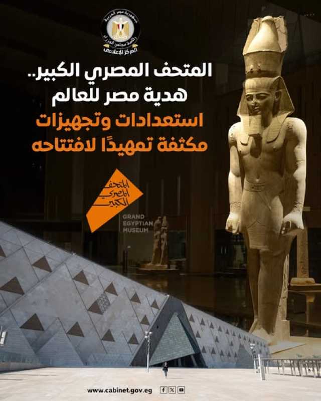 نشر المركز الإعلامي لمجلس الوزراء عددًا من الإنفوجرافات عبر منصاته على مواقع التواصل الاجتماعي، بعنوان "المتحف المصري الكبير.. هدية مصر للعالم.. استعدادات وتجهيزات مكثفة تمهيدًا لافتتاحه".