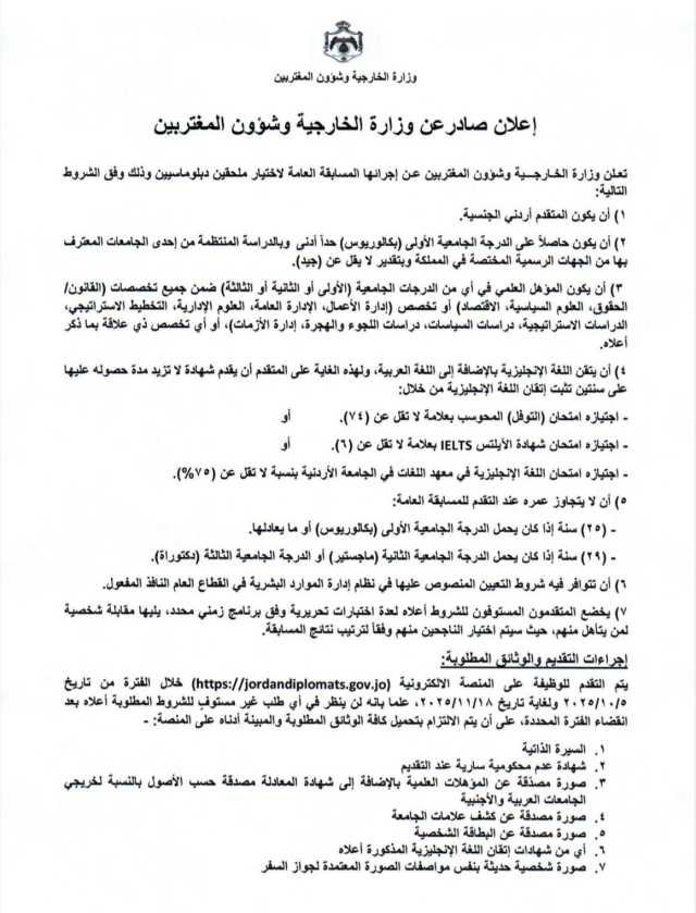 تدعو الوزارة الراغبين في التقدم لوظيفة ملحق دبلوماسي، التسجيل عبر المنصة الإلكترونية jordandiplomats.gov.jo.