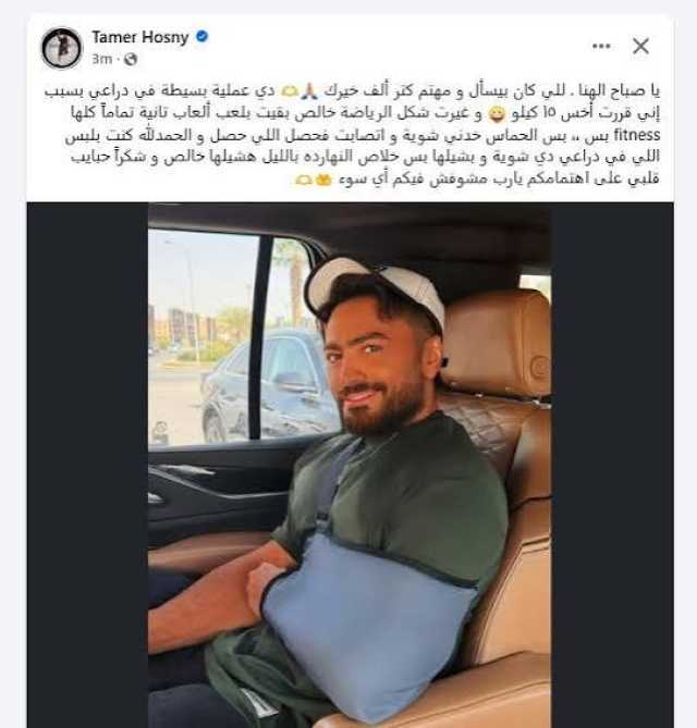 طمأن النجم تامر حسني جمهوره ومتابعيه على حالته الصحية بعد العملية الجراحية التي خضع لها مؤخرًا في ذراعه، وذلك من خلال منشور شاركه عبر حسابه الرسمي على مواقع التواصل الاجتماعي، أكد فيه أن حالته الآن مستقرة ويتماثل للشفاء.