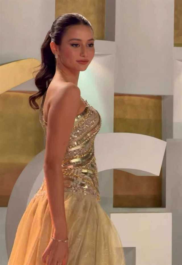 وبدت لينا صوفيا بإطلالة ذهبية، مرتديه فستان طويل مجسم من أعلى وفضفاض من أسفل فضفاض، صمم من قماش الترتر مع التل ليعكس جمالها و يؤكد حرصها على مواكبة أحدث صيحات الموضة العالمية 2025.