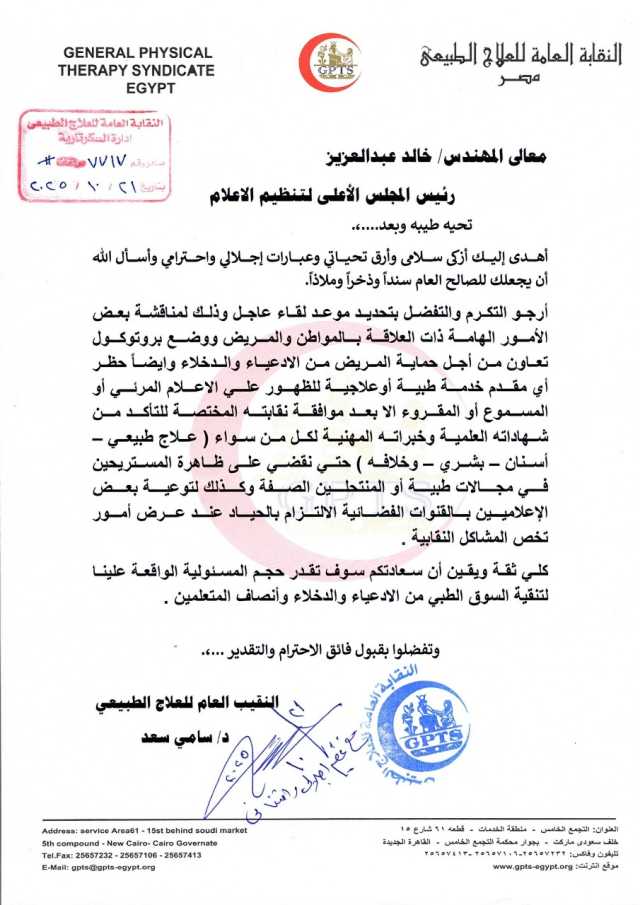 خاطبت النقابة العامة للعلاج الطبيعي، المهندس خالد عبدالعزيز رئيس المجلس الأعلى لتنظيم الإعلام، تطالب فيه بعقد لقاء عاجل لمناقشة عدد من القضايا المتعلقة بحماية المواطن والمريض من الممارسين غير المؤهلين في المجال الطبي.