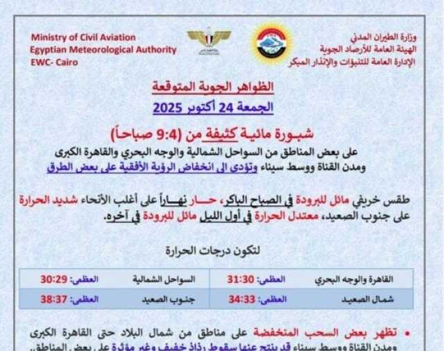 الطقس.. كشفت الهيئة العامة لـ الأرصاد الجوية عن حالة الطقس غدا الجمعة 23 أكتوبر 2025.