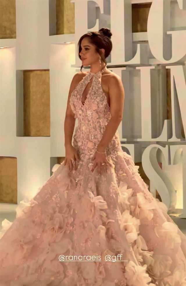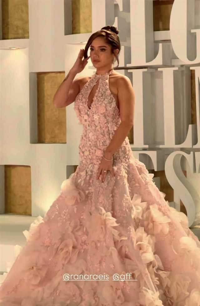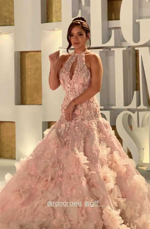 وبدت رنا رئيس بإطلالة مفعمة بالحب والرومانسية والأمل ، مستوحاه من طبيعة الزهور الطبيعية في بستان الزهور، مرتديه فستان طويل مجسم من أعلى وفضفاض من أسفل، ، صمم من قماش الحرير باللون البينك وزين بالزهور الناعمة بالكامل، لتواكب أحدث صيحات الموضة العالمية 2025.