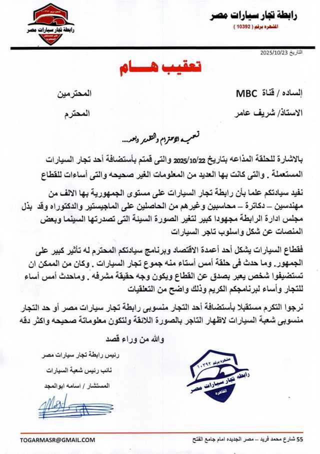 أصدرت رابطة تجار سيارات مصر برئاسة المستشار أسامة أبوالمجد بيانا صحفياً أعربت فيه عن استيائها لما ورد فى حلقة أمس من برنامج «يحدث فى مصر» للإعلامى شريف عامر المذاع على قناة «أم بى سى مصر» والذى استضاف خلالها أحد تجار السيارات المستعملة.