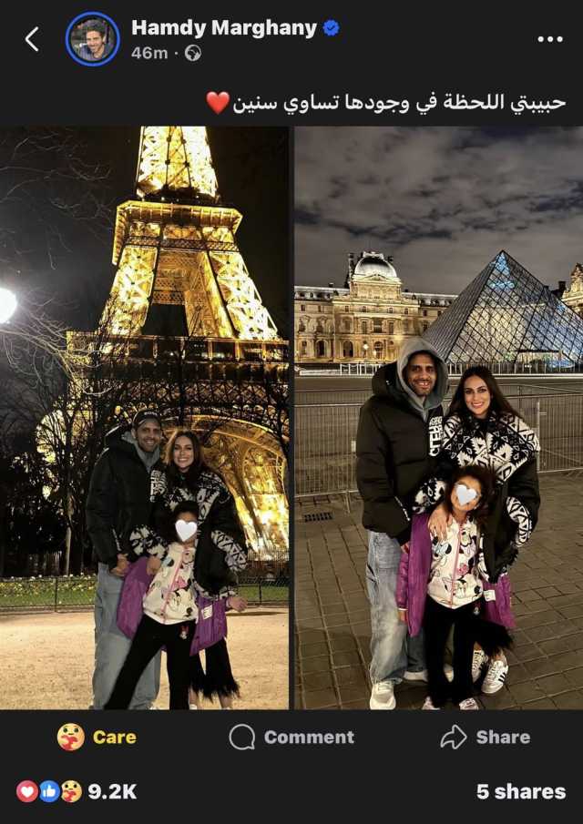 ظهر حمدي الميرغني وزوجته إسراء من أمام برج إيفل ووجه لها رسالة حب قائلًا: “حبيبتي اللحظة في وجودها تساوي سنين”، وذلك خلال منشور عبر حسابه الشخصي بموقع التواصل الإجتماعي الأشهر “فيس بوك”