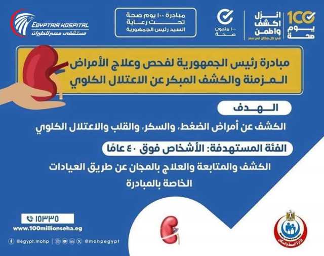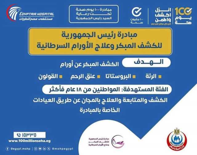 في إطار دعم المبادرات الرئاسية التي أطلقها السيد الرئيس عبد الفتاح السيسي، وتأكيدًا على دورها الرائد في خدمة المجتمع، تعلن مستشفى مصر للطيران عن استضافتها لإحدى مبادرات "100 مليون صحة" تحت شعار "انزل – اكشف – اطمن"، وذلك للكشف المبكر وعلاج الأورام السرطانية والأمراض المزمنة بالمجان للعاملين والمواطنين.