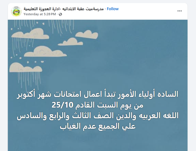 ونبهت المدارس على جميع الطلاب بعدم التخلف عن حضور امتحانات شهر أكتوبر 2025 ، حيث أن درجة امتحان الشهر أساسية في نتيجة امتحانات الترم الاول ، مؤكدةً أنه لن يسمح بإعادة الامتحان لأي طالب