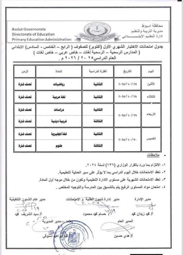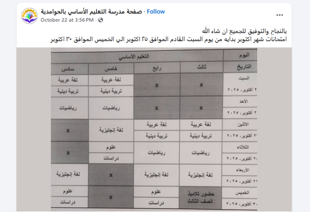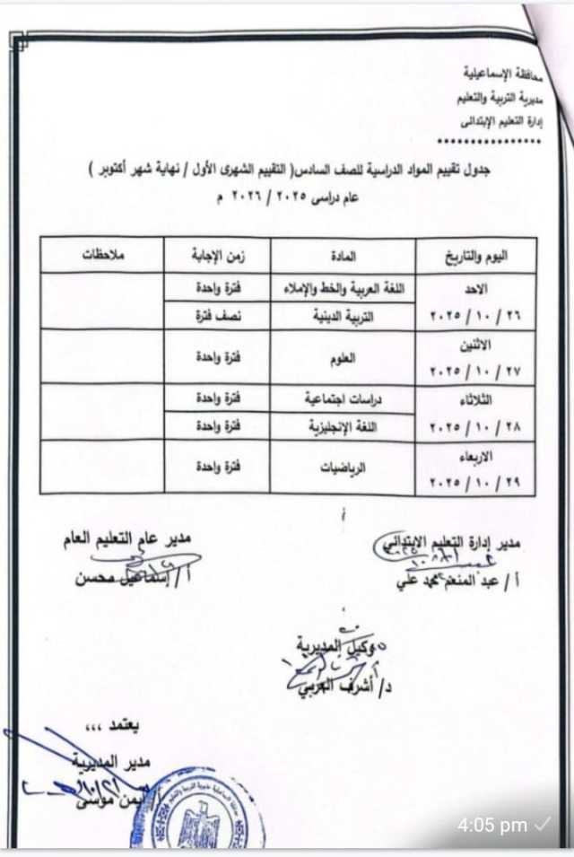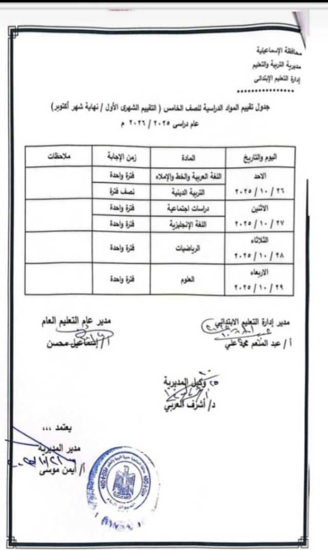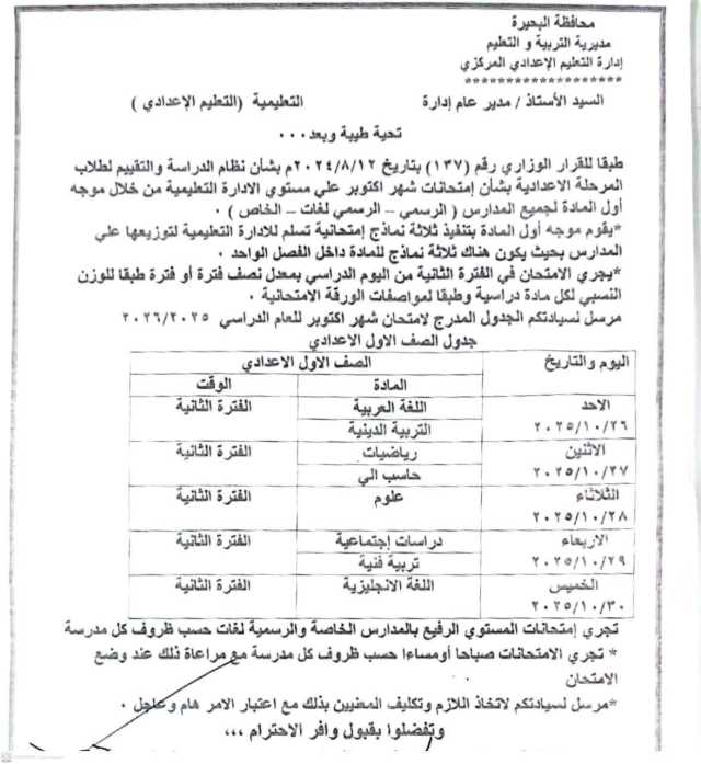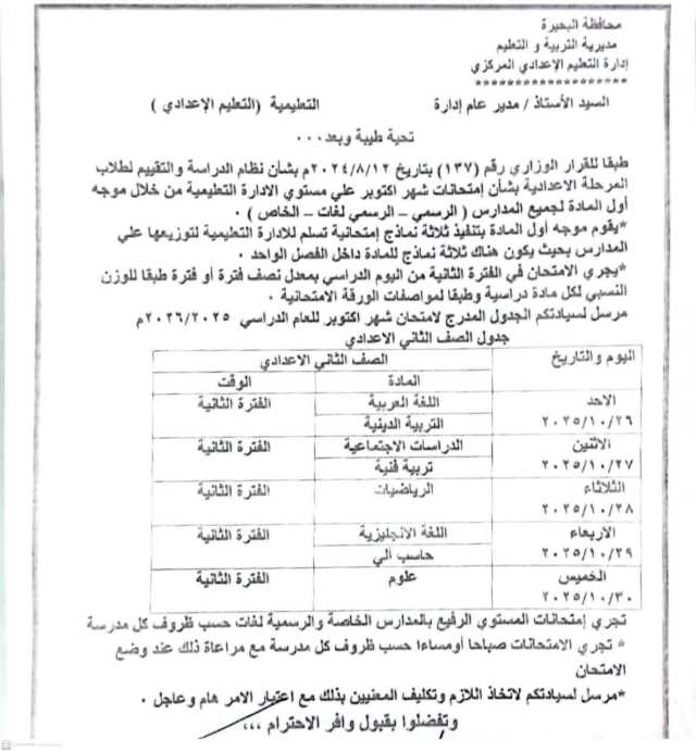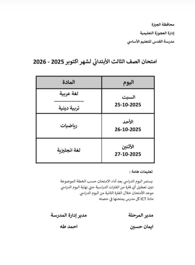 وتنعقد امتحانات شهر أكتوبر 2025 لجميع الصفوف الدراسية حسب جدول امتحانات شهر أكتوبر 2025 المعلن في المديريات والإدارات التعليمية والمدارس .