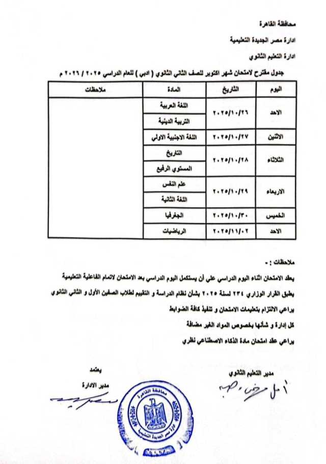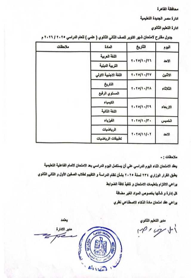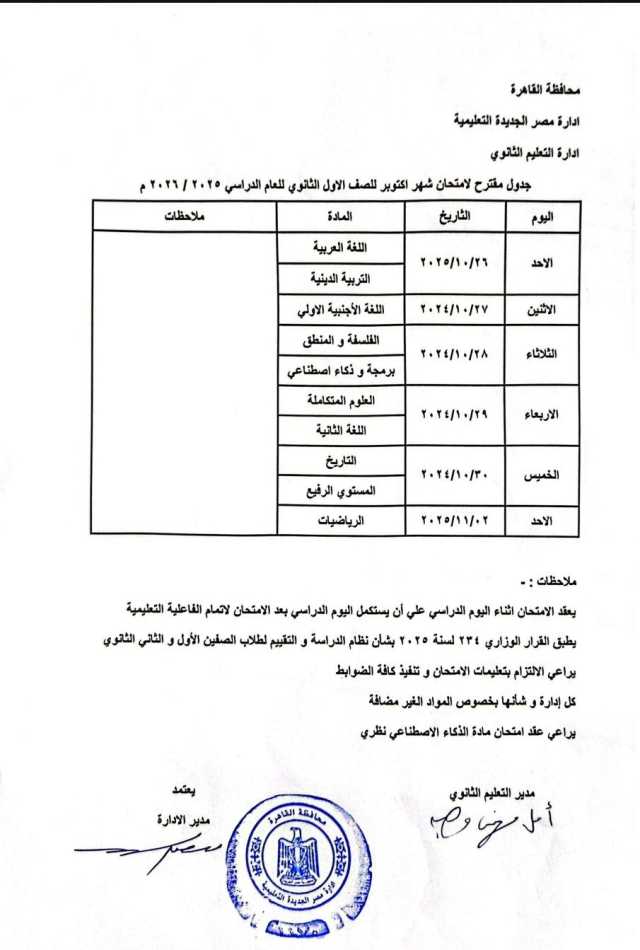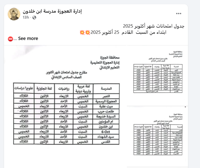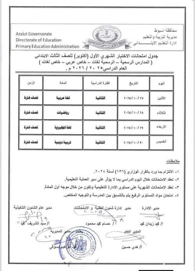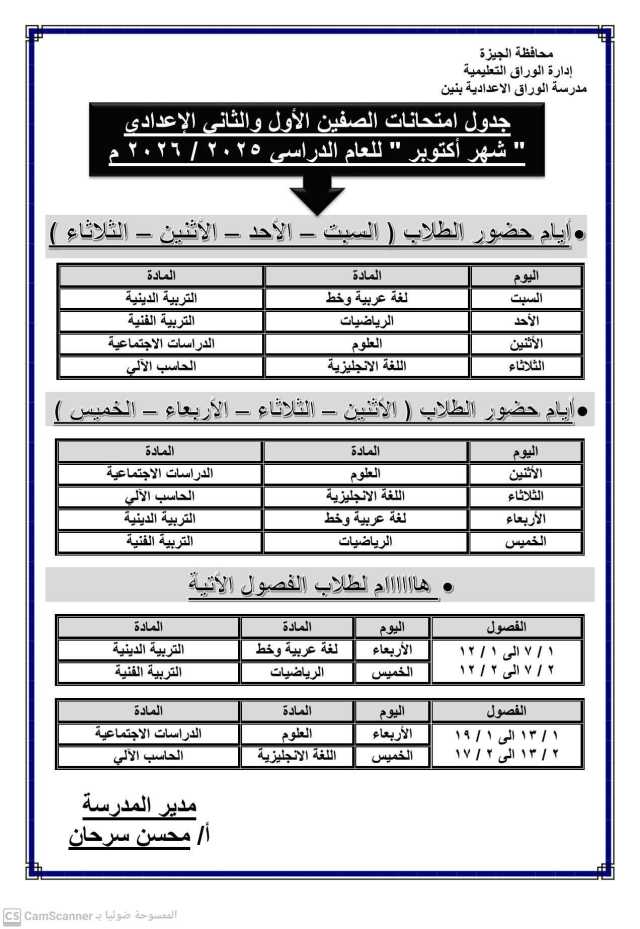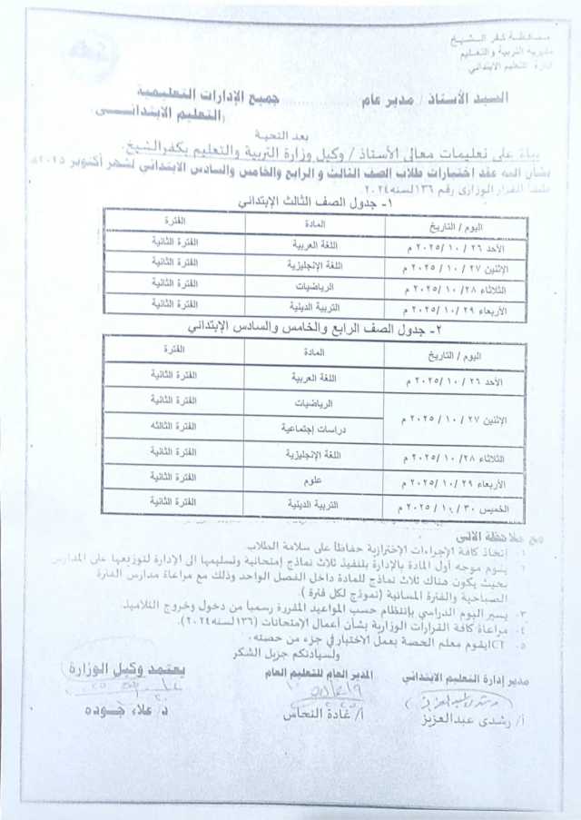 وتنعقد امتحانات شهر أكتوبر 2025 لجميع الصفوف الدراسية حسب جدول امتحانات شهر أكتوبر 2025 المعلن في المديريات والإدارات التعليمية والمدارس .