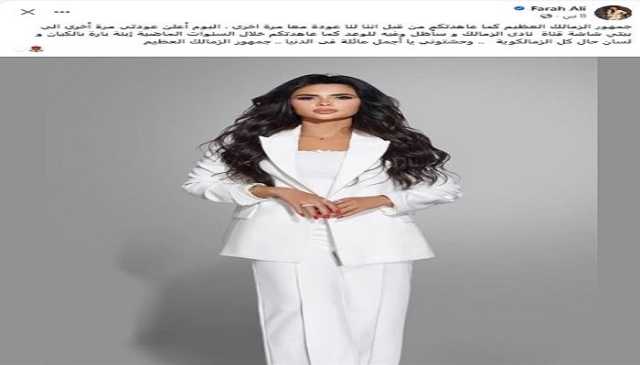 وقالت فرح علي: جمهور الزمالك العظيم كما عاهدتكم من قبل أننا لنا عودة معًا مرة أخرى، اليوم أعلن عودتي مرة أخرى إلى بيتي شاشة قناة نادي الزمالك، وسأظل وفية للوعد كما عاهدتكم خلال السنوات الماضية، ابنة بارة بالكيان ولسان حال كل الزملكاوية.