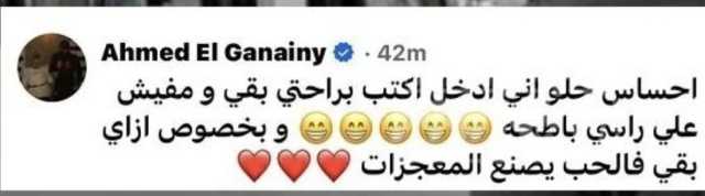 وكتب أحمد الجنايني: “احساس حلو إني ادخل اكتب براحتي بقى ومفيش على راسي بطحة”، متابعًا: “وبخصوص ازاي بقى فالحب يصنع المعجزات”.