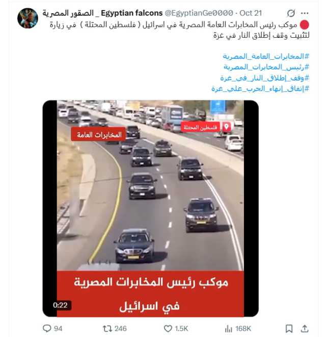 وحصد الفيديو مئات الآلاف من المشاهدات في مختلف الشبكات الاجتماعية، مصحوبًا بوصف يقول: "موكب رئيس المخابرات العامة المصرية في إسرائيل (فلسطين المحتلة) في زيارة لتثبيت وقف إطلاق النار في غزة".
