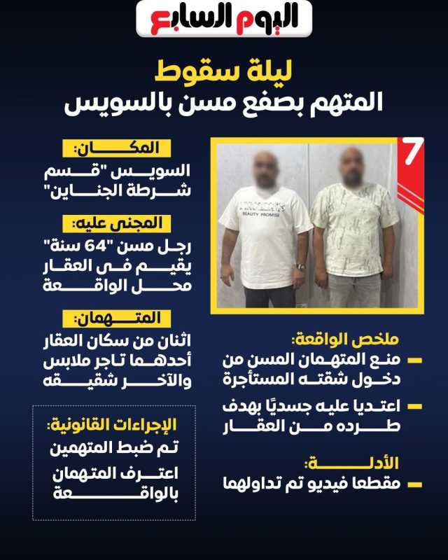 يبرز إنفوجراف أدلة إدانة المتهم بصفع مسن السويس، حيث شهدت مواقع التواصل الاجتماعى تداول مقطعى فيديو يظهران اعتداء شخصين على مسن بمنع دخوله شقته بالسويس، ما أثار حالة من الجدل حول الواقعة.
