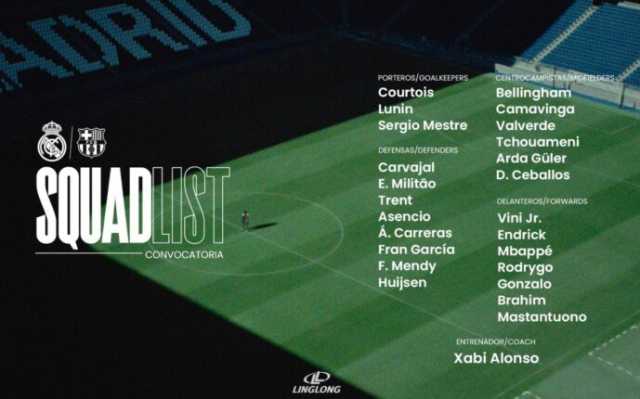 أعلن تشابي ألونسو مدرب ريال مدريد، قائمة الفريق، وذلك لمواجهة برشلونة في قمة الجولة العاشرة، غدًا الأحد، في إطار الدوري الإسباني.