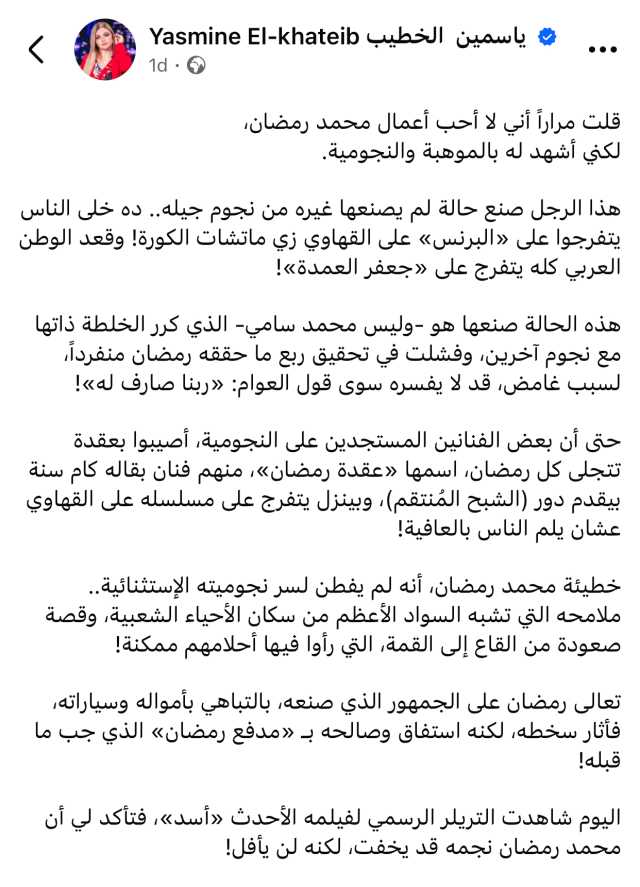وكتبت الخطيب عبر حسابها الشخصي بموقع فيسبوك: “قلت مراراً أني لا أحب أعمال محمد رمضان، لكني أشهد له بالموهبة والنجومية، هذا الرجل صنع حالة لم يصنعها غيره من نجوم جيله.. ده خلى الناس يتفرجوا على «البرنس» على القهاوي زي ماتشات الكورة! وقعد الوطن العربي كله يتفرج على «جعفر العمدة»”.