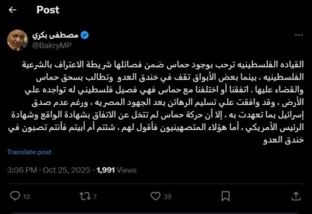 وكتب «مصطفى بكري» في تدوينة له على منصة «إكس»، تويتر سابقًا: «القيادة الفلسطينية ترحب بوجود حماس ضمن فصائلها شريطة الاعتراف بالشرعية الفلسطينية، بينما بعض الأبواق تقف في خندق العدو وتطالب بسحق حماس والقضاء عليها».