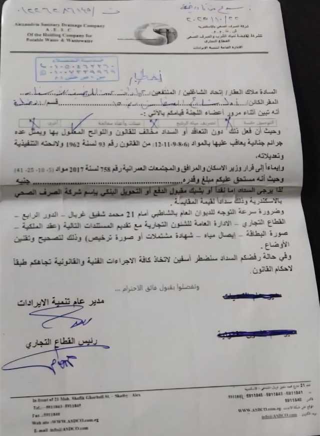 كلمات دلالية: إدارة الصرف الصحي الإسكندرية تحليل المياه غرامة مالية الصرف الصحى طبيب