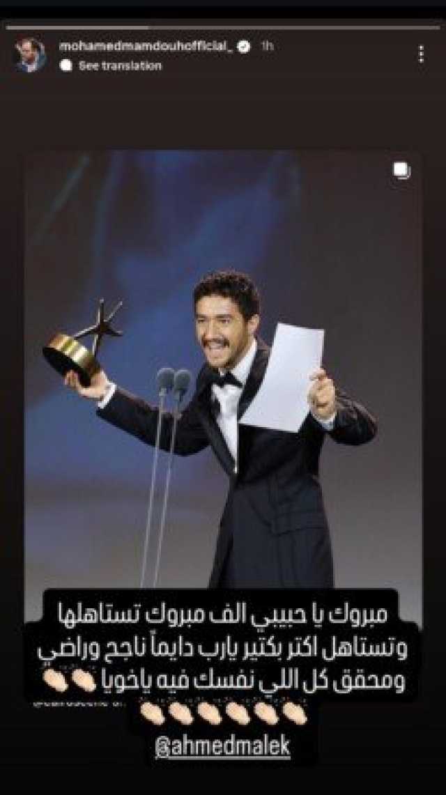 وفي هذا السياق، وجه محمد ممدوح، عبر حسابه الرسمي بموقع تداول الصور والفيديوهات «إنستجرام» رسالة لـ أحمد مالك، مشيدا بفوزه بجائزة أفضل ممثل، قائلا: «مبروك يا حبيبي ألف مبروك تستاهلها وتستاهل أكتر بكتير، يارب دايمًا ناجح وراضي وحقق كل اللي نفسك فيه يا أخويا».