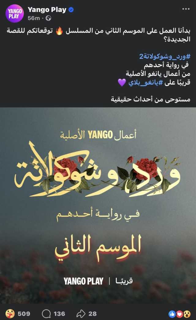 وتابعت: “#ورد_وشوكولاتة2 في رواية أحدهم.. من أعمال يانغو الأصلية قريبًا على #يانغو_بلاي … مستوحى من أحداث حقيقية”، كما أرفقت المنشور بالبوستر الرسمي للمسلسل والذي يحمل اسمه ورد وشوكولاتة في رواية أحدهم.
