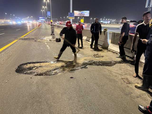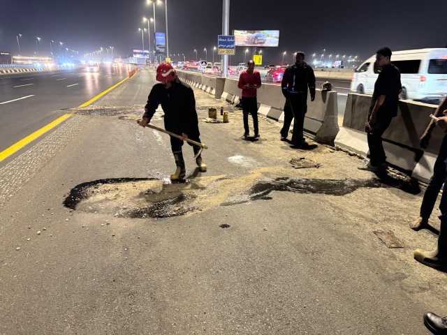 كما نتج عن الحادث وجود إنسكابات بتروليه من چراكن الزيت على مساحه (١٠)متر متفرقين جارى إزالتها بالرمال بمعرفه القوات مع عدم إعاقه للحركه المرورية للطريق وتم اتخاذ الإجراءات القانونية اللازمة تجاه الواقعة.