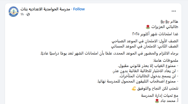 ونبهت المدارس على جميع الطلاب بعدم التخلف عن حضور امتحانات شهر أكتوبر 2025 ، حيث أن درجة امتحان الشهر أساسية في نتيجة امتحانات الترم الاول ، مؤكدةً أنه لن يسمح بإعادة الامتحان لأي طالب