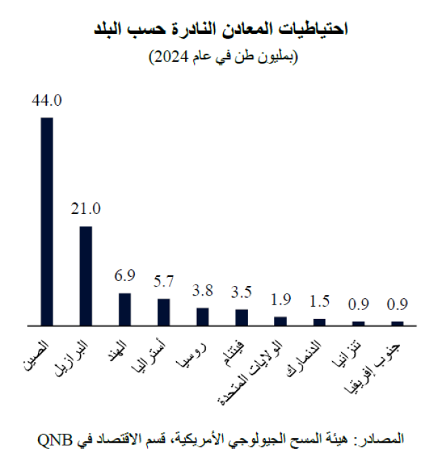 قال QNB بشكل عام، كانت المعادن النادرة أساسية للثورة الإلكترونية والرقمية، وتزداد أهميتها مع ظهور صناعات وتقنيات جديدة. أصبح الذكاء الاصطناعي، وأشباه الموصلات، والدفاع والطيران، بالإضافة إلى الانتقال الطاقي، من أهم القطاعات الاستراتيجية في القرن الحادي والعشرين، وتتطلب نمواً هائلاً في إمدادات المعادن النادرة. وهذا الأمر يعزز هيمنة الصين على سلاسل التوريد هذه، وينشئ اختناقات ونقاط ضعف للولايات المتحدة والمنافسين الآخرين.