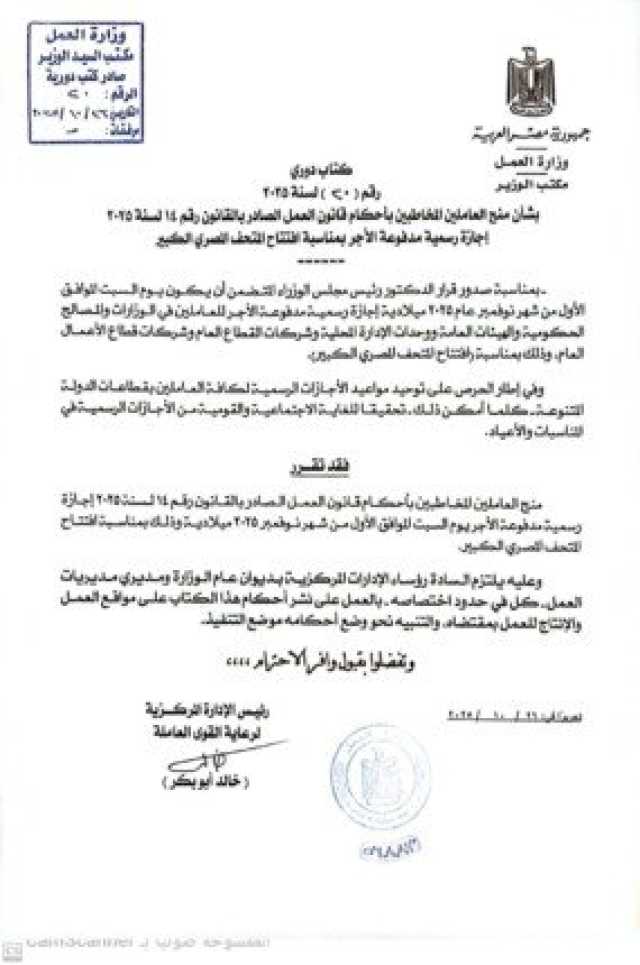 أعلن محمد جبران، وزير العمل، أن يوم السبت المقبل الموافق 1 نوفمبر 2025 سيكون إجازة رسمية مدفوعة الأجر للعاملين بالقطاع الخاص الخاضعين لأحكام قانون العمل الصادر بالقانون رقم 14 لسنة 2025، وذلك بمناسبة افتتاح المتحف المصري الكبير.