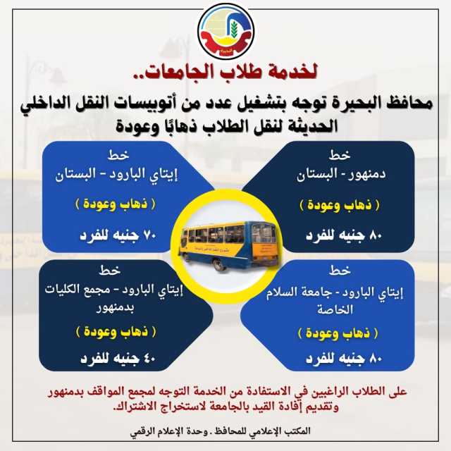 فقد تم تخصيص عدد من أتوبيسات النقل الداخلي الحديثة لنقل طلاب الجامعات، وذلك بالتنسيق بين محافظة البحيرة وجامعة دمنهور ومجمع المواقف، بهدف توفير خدمة نقل آمنة ومنتظمة للطلاب من المدن والمراكز إلى مقار الجامعات.
