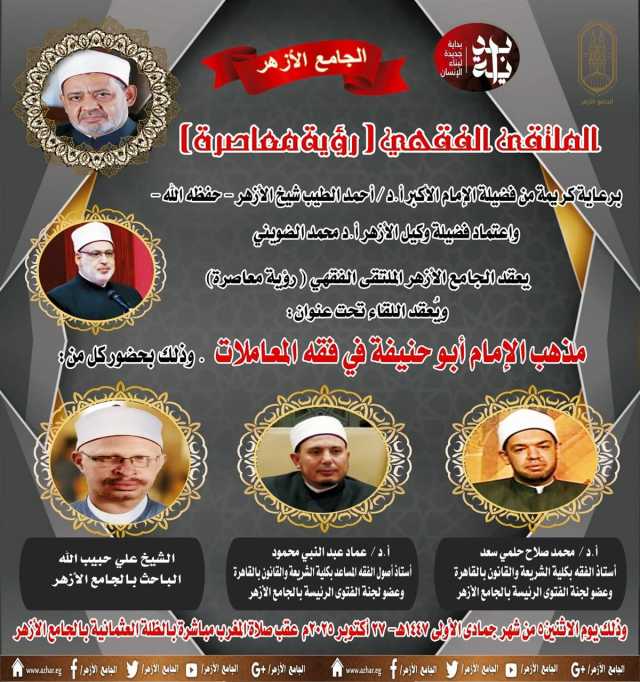 يعقد غدًا الجامع الأزهر الملتقى الفقهي بين الشرع والطب الثالث والثلاثون بعنوان "رؤية معاصرة"، والذي يناقش على مائدته: مذهب الإمام أبو حنيفة في فقه المعاملات "رؤية فقهية".