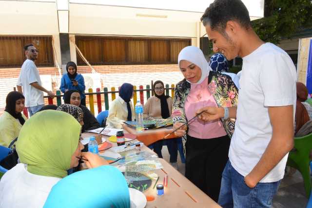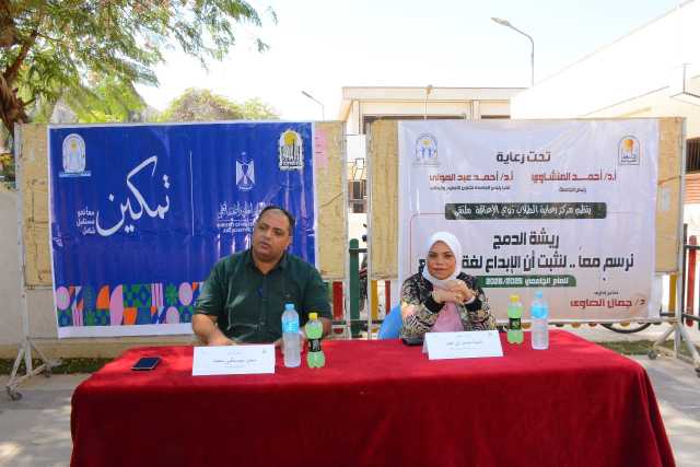 حقوق الطلاب ذوي الإعاقة داخل المجتمع الجامعيوأوضحت الدكتورة أمنية عبد القادر أن المبادرة تهدف إلى التوعية بحقوق الطلاب ذوي الإعاقة داخل المجتمع الجامعي، وتيسير كافة سبل الإتاحة والدمج، والتعريف بخدمات مركز رعاية الطلاب ذوي الإعاقة، وتنمية الوعي بثقافة الشمول والمساواة بين الطلاب وأعضاء هيئة التدريس والعاملين بالجامعة. وتم اليوم تنفيذ النشاط الفني "ريشة الدمج.. نرسم معًا لنثبت أن الإبداع لغة الجميع" بمشاركة 78 طالبًا وطالبة، منهم 43 من الطلاب ذوي الإعاقة و35 من زملائهم الأسوياء، حيث تعاونوا معًا في رسم لوحات مشتركة، إلى جانب إنتاج عدد من اللوحات الفردية التي عبّرت عن الأمل والتعاون والمساواة، وتضمنت مناظر طبيعية وتصاميم ابتكارية، باستخدام الطباعة على الخشب والورق بألوان الجواش، والاستنسل، والحفر على الألومنيوم، وأشغال فنية بورق الكانسون الملون.