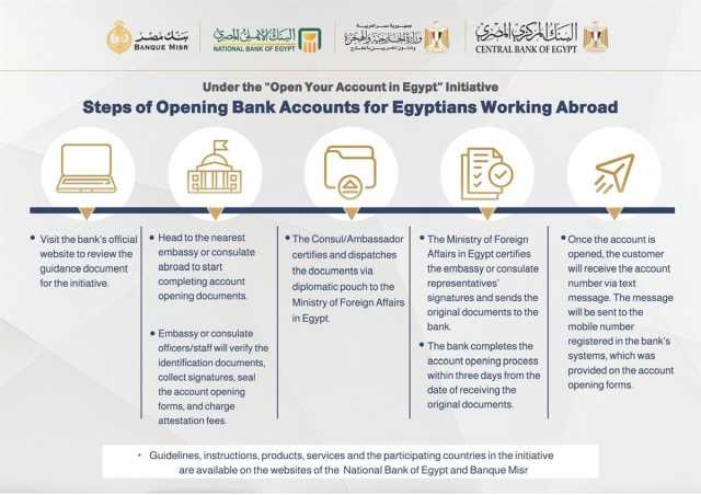 وتتيح المبادرة للمصريين العاملين بالخارج إمكانية فتح حسابات مصرفية في البنك الأهلي المصري أو بنك مصر، من خلال التوجه إلى أقرب مقر بعثة دبلوماسية أو قنصلية مصرية بالخارج، لاستيفاء النموذج الخاص بفتح الحساب والتوقيع عليه ثم التصديق عليه من جانب السفارة أو القنصلية التي ستتولى إرساله إلى ديوان وزارة الخارجية لمتابعة توثيق الأوراق ثم تسليمها إلى البنكين.