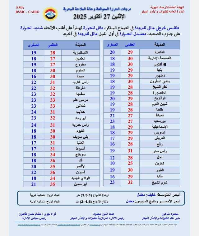 أعلنت هيئة الأرصاد الجوية توقعات حالة الطقس اليوم السبت، 25 أكتوبر 2025، والتي تشهد طقسًا خريفيًا مائلًا للبرودة في الصباح الباكر؛ حارًا نهارا على أغلب أنحاء الجمهورية، شديد الحرارة على جنوب الصعيد معتدل الحرارة في أول الليل، مائلًا للبرودة في آخره.