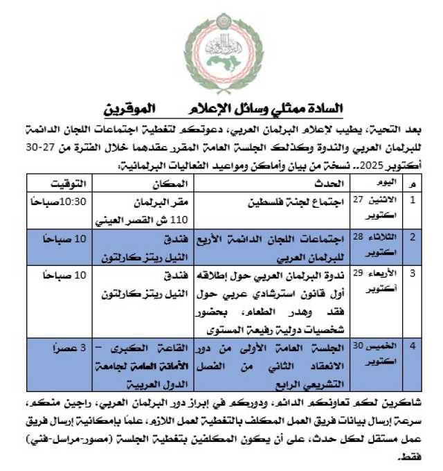 البرلمان العربي يبدأ اجتماعاته التحضيرية بمناقشة اتفاق شرم الشيخ للسلام