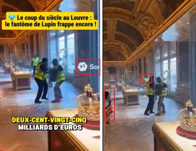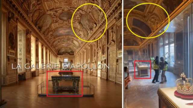 وبمقارنة الفيديو المتداول مع فيديو نشره متحف اللوفر عبر حسابه على يوتيوب لقاعة "أبولو" التي تعرضت للسرقة، سنجد اختلافات كبيرة في تصميم صناديق العرض الزجاجية واللوحات الفنية في سقف القاعة.