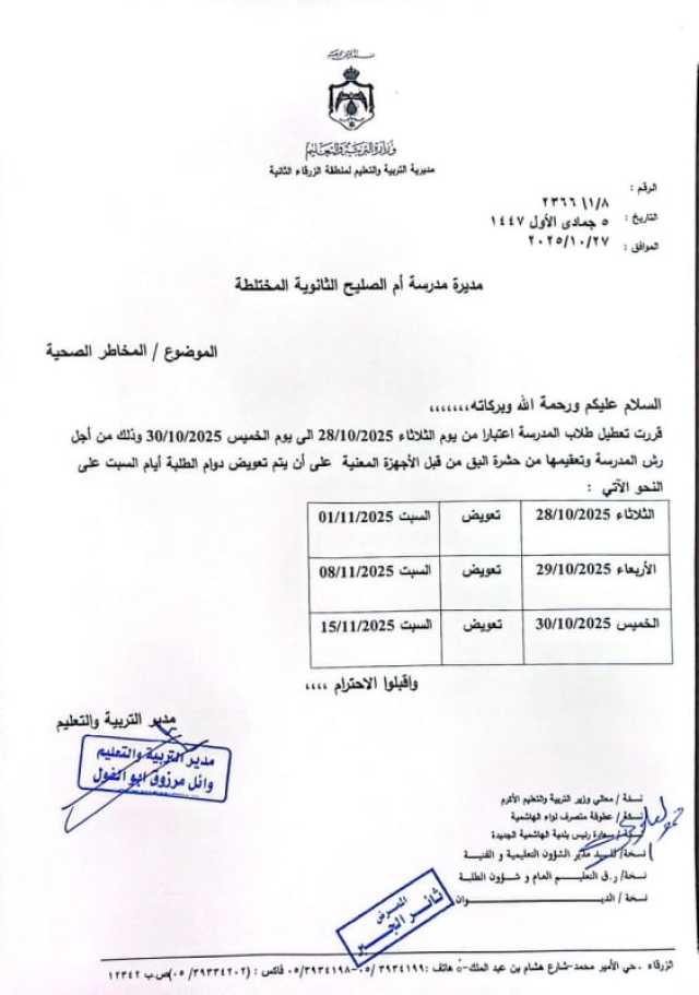 ووفق القرار، تم إبلاغ إدارة مدرسة أم صليح الثانوية بتعطيل الدوام اعتبارًا من الثلاثاء 28/10 وحتى الخميس 30/10، لإجراء عملية رش وتعقيم شاملة بإشراف الجهات المختصة.