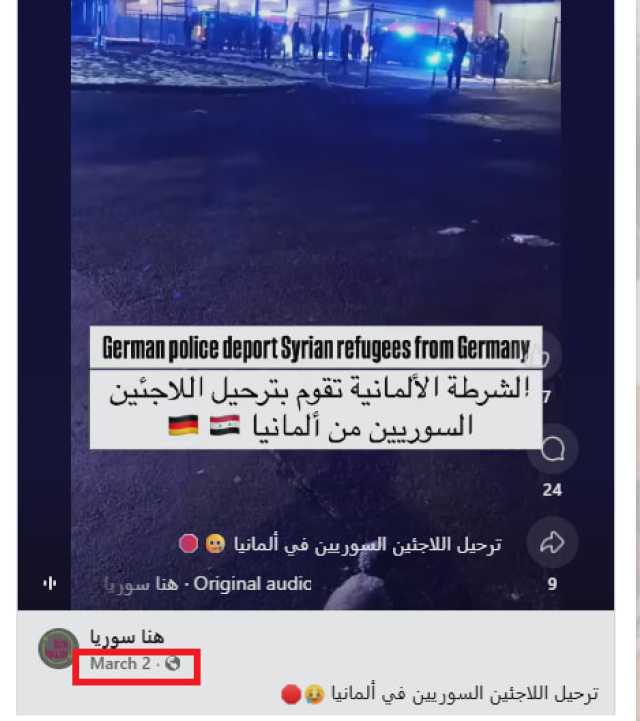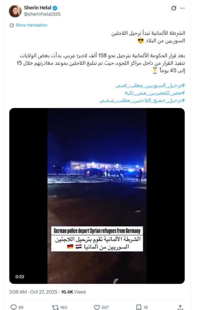 حظي الفيديو بعشرات الآلاف من المشاهدات في منصة إكس، مصحوبًا بوصف يقول: "الشرطة الألمانية تقوم بترحيل اللاجئين السوريين من ألمانيا".