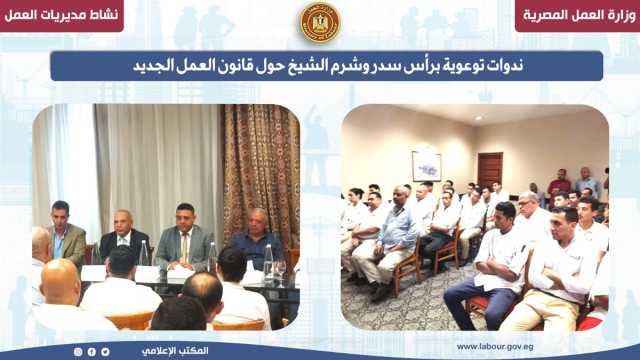 نظمت مديرية العمل بجنوب سيناء، ندوتين توعويتين في مدينتي رأس سدر وشرم الشيخ تناولتا التعريف بأحكام قانون العمل الجديد رقم (14) لسنة 2025 وقرار وزير العمل رقم (187) لسنة 2025، تنفيذًا لتوجيهات الوزير محمد جبران بنشر ثقافة العمل اللائق ومعايير السلامة المهنية.