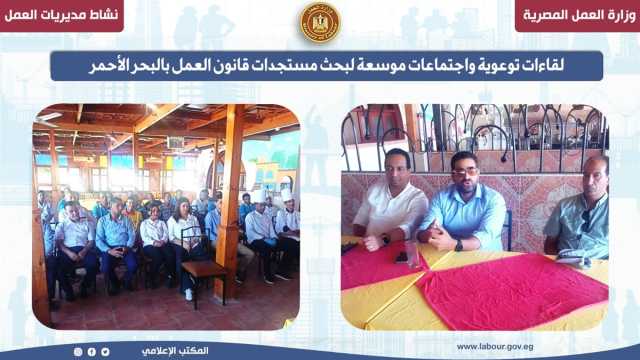 نظمت مديرية العمل بمحافظة البحر الأحمر عددًا من الفعاليات التوعوية واللقاءات الموسعة لتعزيز ثقافة العمل اللائق وتحقيق بيئة عمل آمنة ومستقرة.