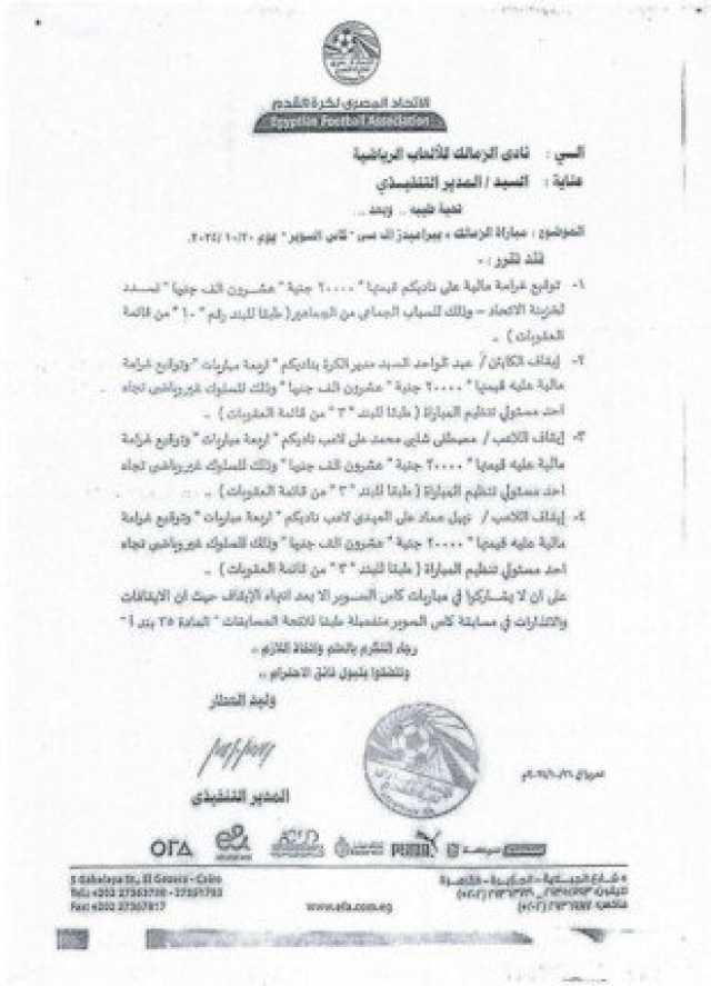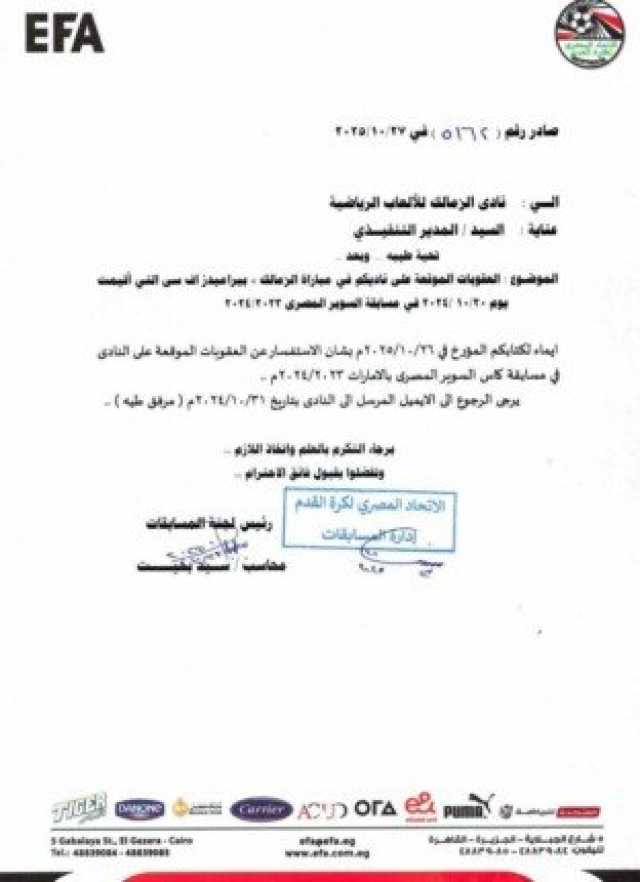 أرسلت إدارة المسابقات بالاتحاد المصري لكرة القدم، اليوم، خطابًا رسميًا إلى نادي الزمالك للألعاب الرياضية، ردًا على استفسار النادي المرسل أمس بشأن العقوبات الصادرة بحقه في بطولة كأس السوبر المصري التي أُقيمت في الإمارات لموسم 2023-2024.