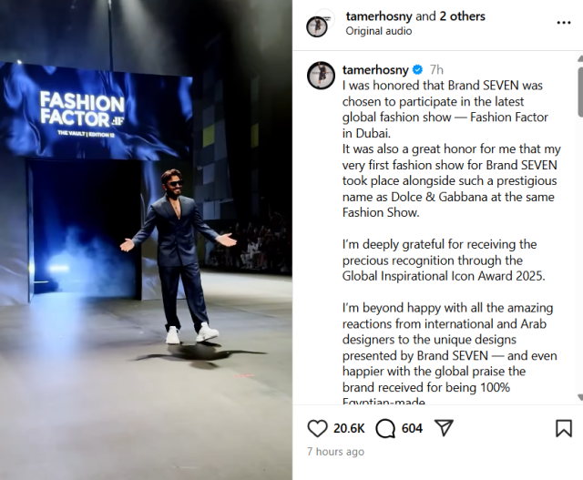 أعرب النجم تامر حسني عن بالغ سعادته وامتنانه بمنحه جائزة أيقونة الإلهام العالمية لعام 2025، بالإضافة إلى اختيار علامة SEVEN له للمشاركة في أحدث عرض أزياء عالمي في دبي بجوار اسم مرموق مثل دولتشي آند غابانا، وذلك خلال منشور عبر حسابه الشخصي بموقع تبادل الصور والفيديوهات “انستجرام”.