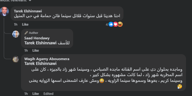 كما أشار أحد المتابعين في تعليقه أيضًا إلى سينما ماجدة بحلوان، وسينما شهر زاد بالجيزة، حيث قال: “وماجده بحلوان دى على اسم الفنانه ماجده الصباحي ، وسينما شهر زاد بالجيزه ، كان على اسم المطربه شهر زاد ، لما كانت مشهوره بشكل كبير، وسينما كريم ، بعوها وسموها سينما الزاوية، ومش عارف اشمعنى اسمها الزاوية يعني”.