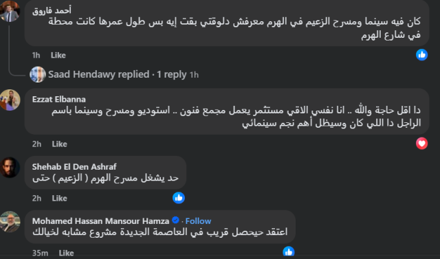 كما علق آخرون مناشدين بإعادة فتح سينما ومسرح الزعيم في الهرم، حيث قالوا: “كان فيه سينما ومسرح الزعيم في الهرم معرفش دلوقتي بقت إيه بس طول عمرها كانت محطة في شارع الهرم”، في حين أكد أحدهم أنه من المرتقب إنشاء مجمع فنون يضم سينما ومسرح واستوديو باسم عادل إمام.