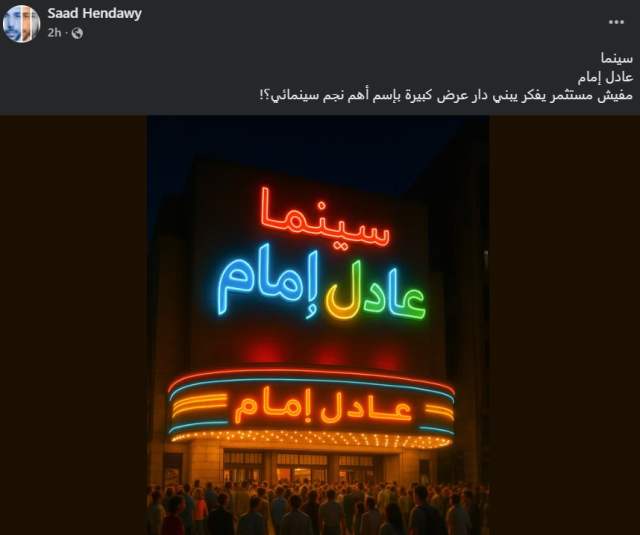 طالب سعد هنداوي بإنشاء دار عرض سينمائي كبيرة تحمل اسم النجم الكبير الزعيم عادل إمام، حيث تساءل قائلًا: “سينما .. عادل إمام .. مفيش مستثمر يفكر يبني دار عرض كبيرة بإسم أهم نجم سينمائي؟!”.