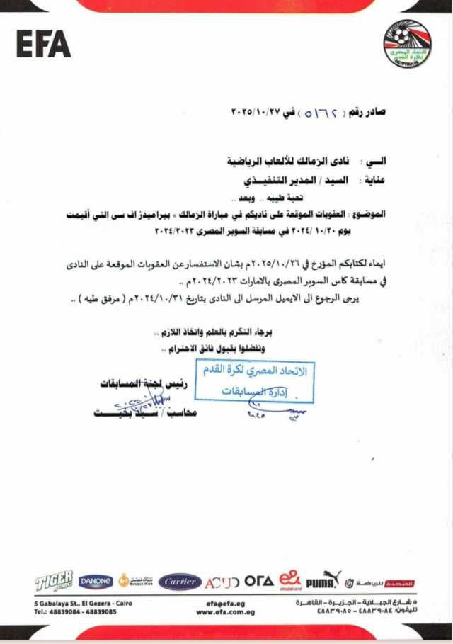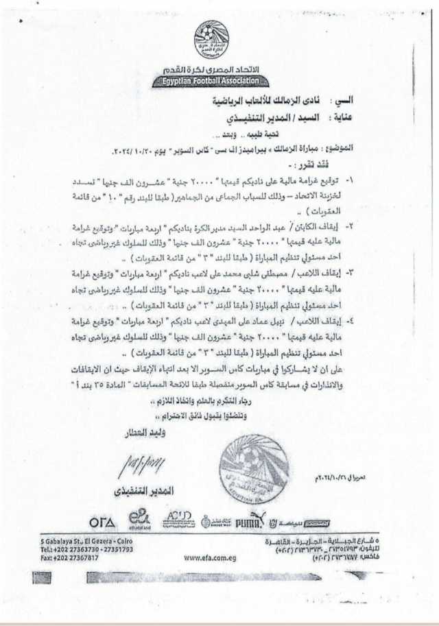 وتضمنت طيات خطاب اتحاد الكرة مطالبة نادي الزمالك بالرجوع إلي البريد الإليكتروني لمراجعة وصول الإيميل الخاص بعقوبات ثلاثي القلعة البيضاء نبيل عماد دونجا وعبدالواحد السيد مدير الكرة السابق فى القلعة البيضاء ومصطفي شلبي لاعب الفارس الأبيض السابق عقب انتهاء مباراة بيراميدة فى النسخة الماضية من بطولة كاس السوبر المصري.