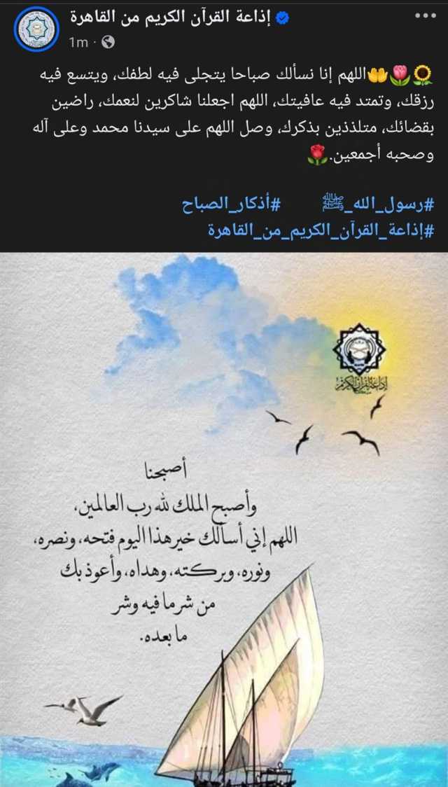 وذكرت إذاعة القرآن الكريم عبر صفحتها الرسمية على موقع التواصل الاجتماعي فيسبوك، أدعية وذكر من أذكار الصباح، والتي يفضل أن ترددها يوميا.