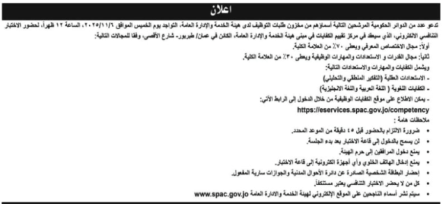 دعت عدد من #الدوائر_الحكومية في #الأردن #مئات_المرشحين ممن تقدموا بطلبات #توظيف عبر ديوان الخدمة المدنية إلى التواجد يوم الخميس الموافق 6/11/2025 الساعة 12 ظهراً، لحضور اختبار التنافسي الإلكتروني.